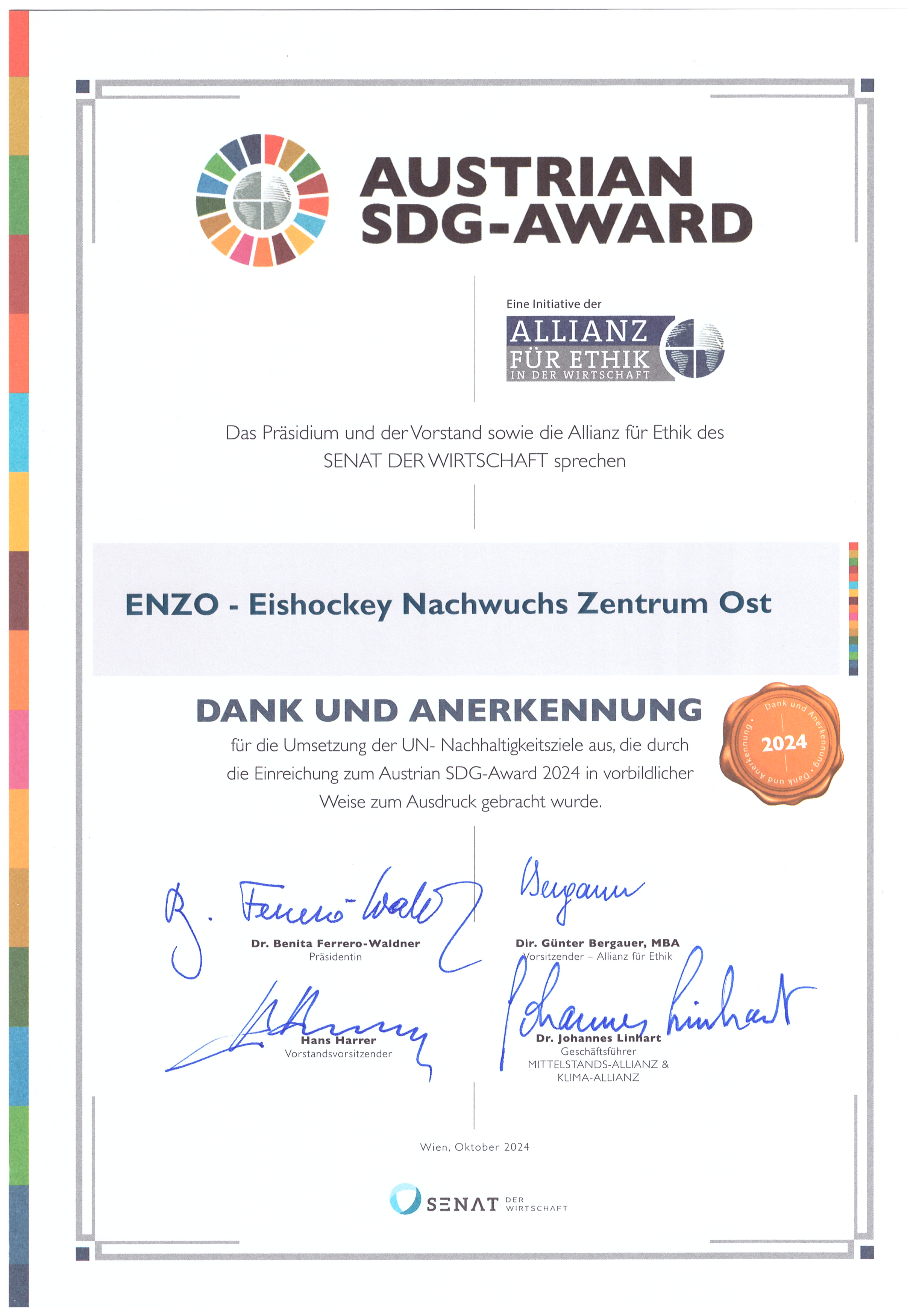 In Würdigung des Engagements bei der Initiative für Kinder bei der Umsetzung der UN-Nachhaltigkeitsziele wurde ENZO die Ehrenurkunde des österreichischen Wirtschaftssenates überreicht.